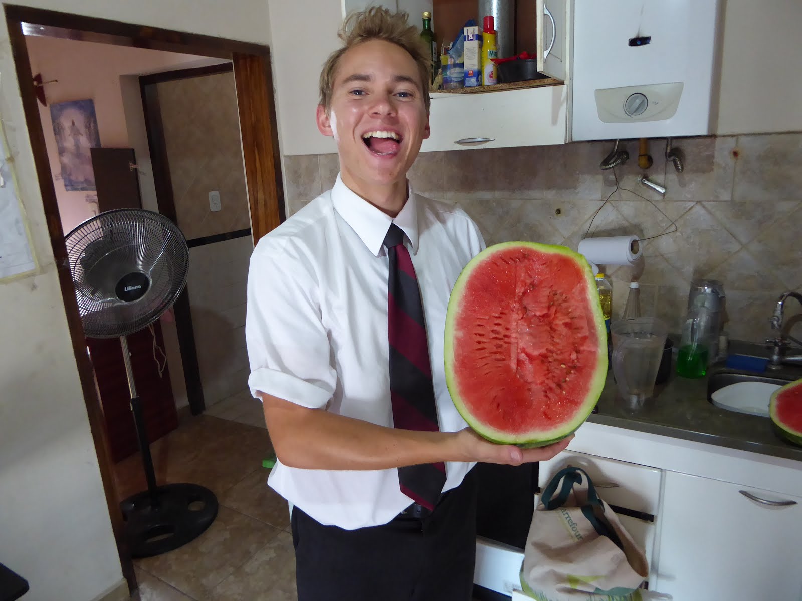 They servin up hot and fresh revelation out here in the mission field..We had a Conferencia Mundial, in which some rules changed...But First I wanted to talk about something they mentioned that I liked a lot. They talked about how sometimes its scary to be a missionary and talk to people about some super deep stuff, but they mentioned how if we have love for those we teach, fear will be eliminated. I love that, and I think it applies to other things too: If we have love, fear will be eliminated.Please check out the February Liahona this week! Its an LDS magazine, but it talks about some super important topics, and I love the one from this month, right down to the cover art. The Liahona frequently talks to kids (in a special kid section) about difficult subjects such as abuse, or pornography. The church is here to build better futures. We need to prepare because this life is scary.I suggest just downloading the PDF and looking through it, anything that catches your eye.-------------------------------------- Someone asked how I found my testimony. I found my testimony here in the mission, but I want you to be able to find yours. If you arent able to pin your testimony down to a specific moment among a lot of wonderful things, thats ok. But I challenge you, with all my blessing, that if you have anything in your life, that you dont like or want to change, sacrifice it for Christ and battle it with all your force. Church leaders are here to help you, not to scold you. This is something I have learned, and my view of the church is so much more from a humanitarian love point of view. I promise that we just want to help people have better lives. Now is your moment. And I promise that the testimony you will gain, will be worth the pain and the suffering that it will require to change.Here is a talk from the Feb Liahona about this topic, but it is filled with this stuff:--------------------------------------- Weird thing about Argentina:Even though this is cow country, all dairy products are ridiculously expensive and we oftentimes do not have enough money to buy milk or cheese. (I love cheese so this is tough haha)LOVE, ELDER AMANN!!!!!!!!!Gracias to the Harrison Family for hooking me up with a Wolf´em stick all the way down here!Heres a picture of me with some sandia!